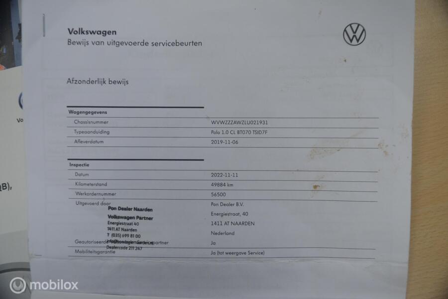 Te koop aangeboden: van eerste eigenaar zeer mooie Volkswagen Polo DSG Automaat 1.0 TSi 95 pk Comfortline Business met Panorama dak. Deze Polo is van 11-2019 en heeft pas 51.550 km gereden. Zeer compleet uitgevoerd met Full map Navigatie, Panorama dak, Cruise controle, Apple carplay/android auto, 4 elek ramen, climate controle, enz, enz. Deze Polo is volledig Volkswagen dealer onderhouden en heeft bij 49.884 km / 11-2022 nog zijn beurt gehad bij Pon Dealer Naarden Door ons geïnspecteerd en APK gekeurd tot 11 januari 2025. Zeer fijn rijdende en zuinige Volkswagen Polo TSi. Inruil is altijd mogelijk (diesels tegen handels bod), graag bellen voor een afspraak op 0651627119.